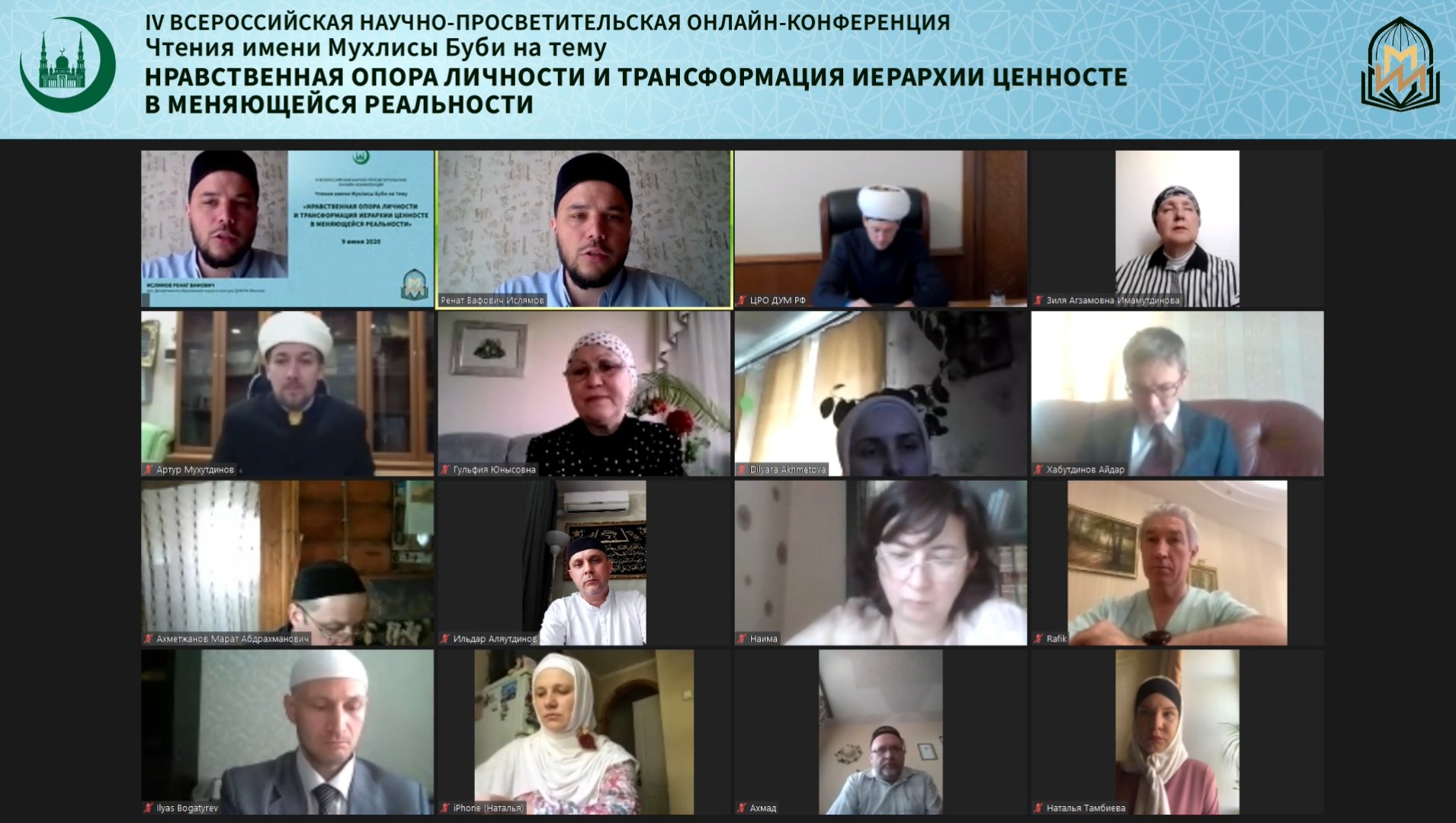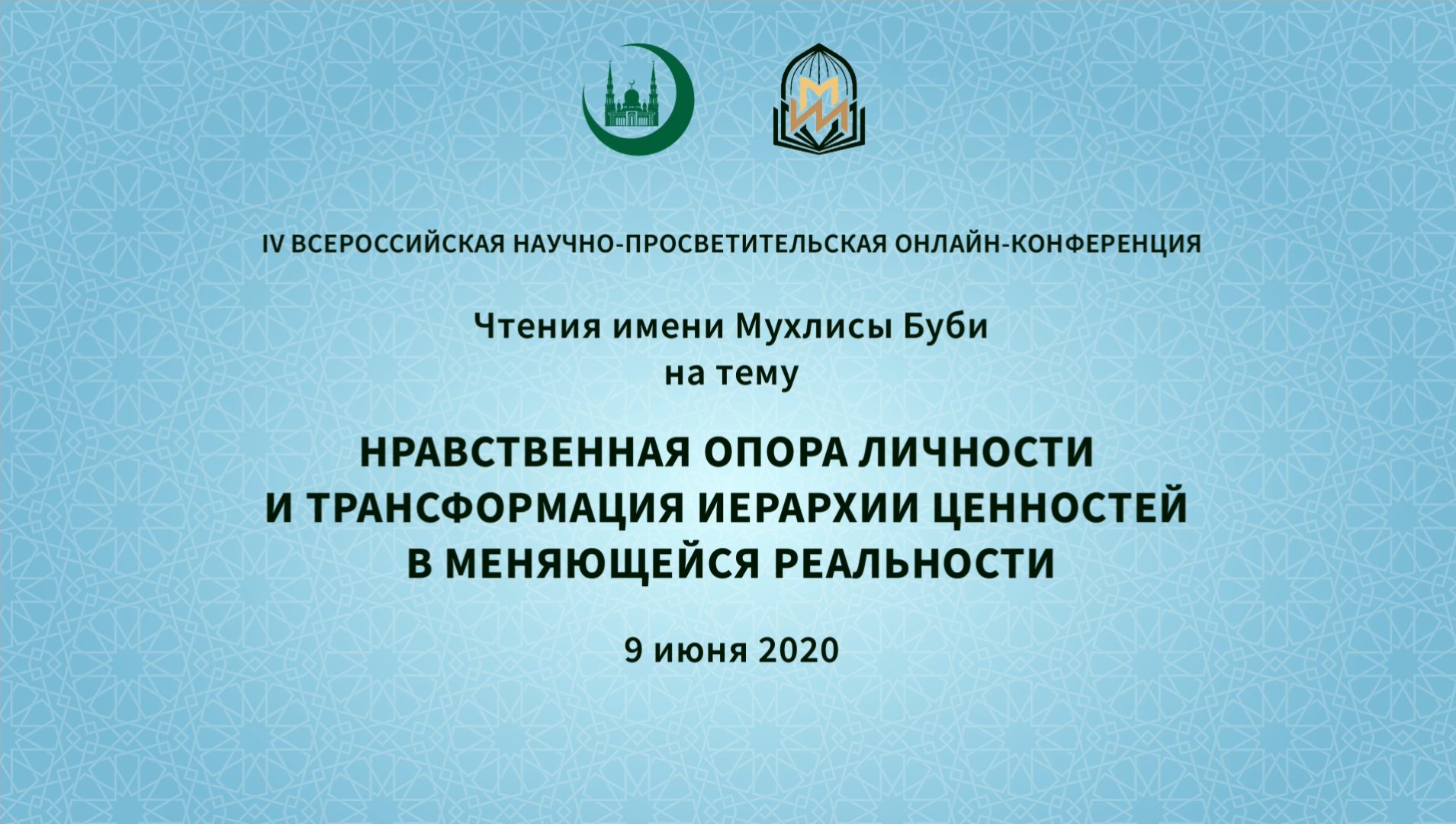 Ежегодная Всероссийская научно-просветительская конференция IV «Чтения им. Мухлисы Буби» в 2020 г. состоялась онлайн. Тема конференции обозначена как «Нравственная опора личности и трансформация иерархии ценностей в меняющейся реальности». Носящая имя выдающейся соотечественницы – первой в истории мусульманского мира женщины-судьи Мухлисы Нигматуллиной-Буби (1869-1937), является научным мероприятием, традиционно сфокусированным на актуальной гуманитарной повестке в преломлении к деятельности женских, благотворительных и просветительских организаций. Организаторами конференции выступили ДУМ РФ и Московский исламский институт.