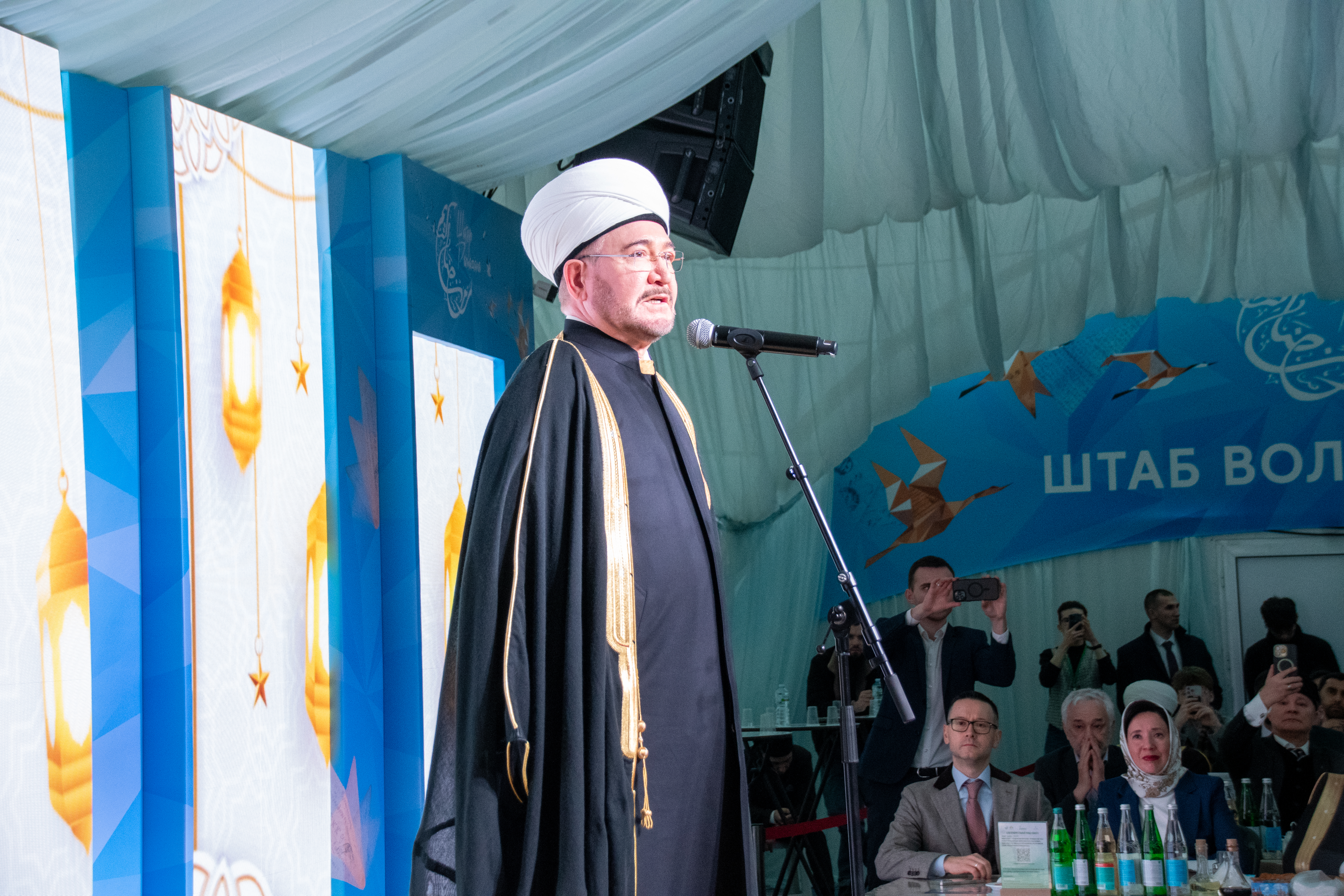 Духовный лидер мусульман России главный муфтий шейх Равиль Гайнутдин, открывая мероприятие, подчеркнул, что месяц Рамадан приближается к последней своей трети, которая считается декадой милости Всевышнего. "В эти благословенные дни все мусульмане молятся о прощении и милости Всевышнего Аллаха", - подчеркнул муфтий Гайнутдин. Он посвятил свое выступление памяти защитников Отечества, павших защищая нашу страну от фашизма во время Великой Отечественной войны и вспомнил годы возведения на Поклонной горе в Москве Мемориальной мечети "Шухада" в честь павших героев.